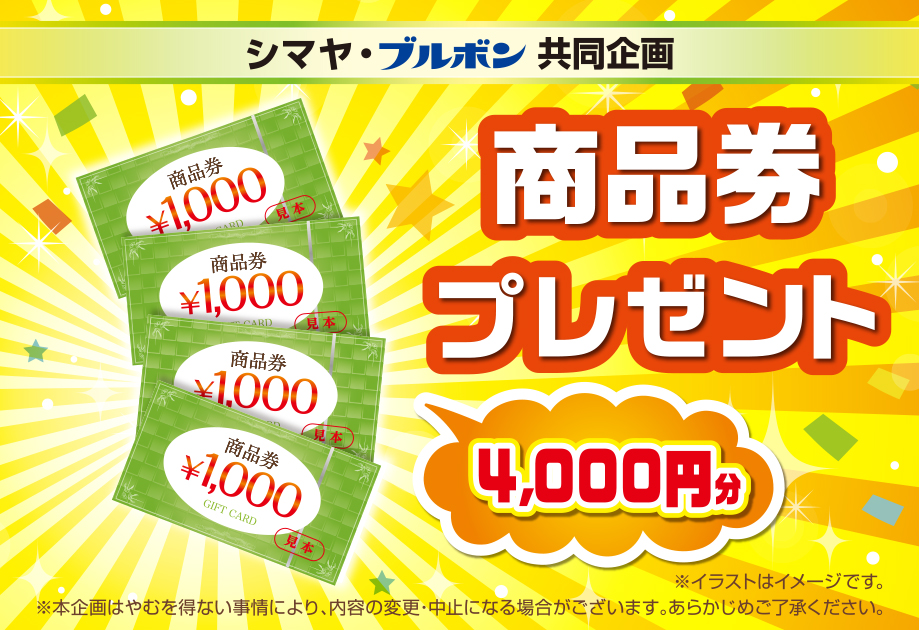 ブルボン商品250円分以上(税込)を含む「シマヤ」レシートをWEBもしくははがきでご応募ください。